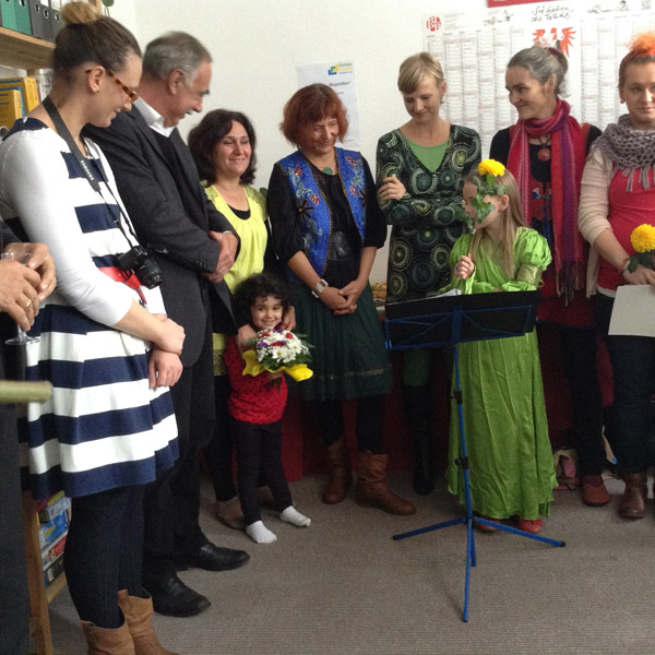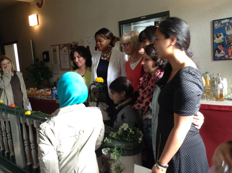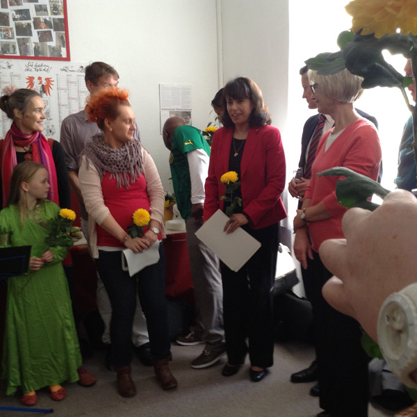Auch Elona Müller-Preinesberger, Sozialabgeordnete der Stadt Potsdam, übermittelte den Dank der Landeshauptstadt an die Träger, professionellen Betreuer, Ehrenamtler und Nachbarn. Das Konzept der produktiven Zusammenarbeit dieser Menschen habe sich in der Hegelallee deutlich bewiesen. Die Wohnstätte für weibliche Flüchtlinge und ihre Kinder betrachtete die Beigeordnete als beispielhaft fürs Wohnen im Quartier. Weitere Wohnprojekte wie der Staudenhof sind bereits entstanden. Die Verbindung zu Nachbarschaft und Ehrenamt solle zukünftig auch in andere Stadtgebiete übertragen werden, um „Ängste der Bürger abzubauen und etwas voneinander zu haben“, so Müller-Preinesberger. Ihre Vision ist „ein Netzwerk für Menschen aus verschiedenen Kulturkreisen – Migranten, die sich mit ihren Erfahrungen in die Netzwerkarbeit einbringen.“ Dazu müssten die jeweiligen Stadtteile eigene Schwerpunkte setzen, wie beispielsweise der Staudenhof-Wohnverbund mit seinem Gartenprojekt. Große Aufgaben stünden bevor: das Schaffen neuer Plätze für Flüchtlinge und die Integrationsarbeit. Ganz nach dem Vorbild der Hegelallee seien für die nahe Zukunft weitere Unterkünfte in der Größenordnung von maximal 60 Personen geplant, um die Integration in der deutschen Bevölkerung beziehungsweise die jeweiligen Stadtteile zu ermöglichen. Zunächst müsse jedoch mit großen Gemeinschaftsunterkünften für bis zu 160 Menschen vorlieb genommen werden. Frau Kindelberger, den Bewohnerinnen und ihren Kindern wünschte Frau Müller-Preinesberger persönlich alles Gute.