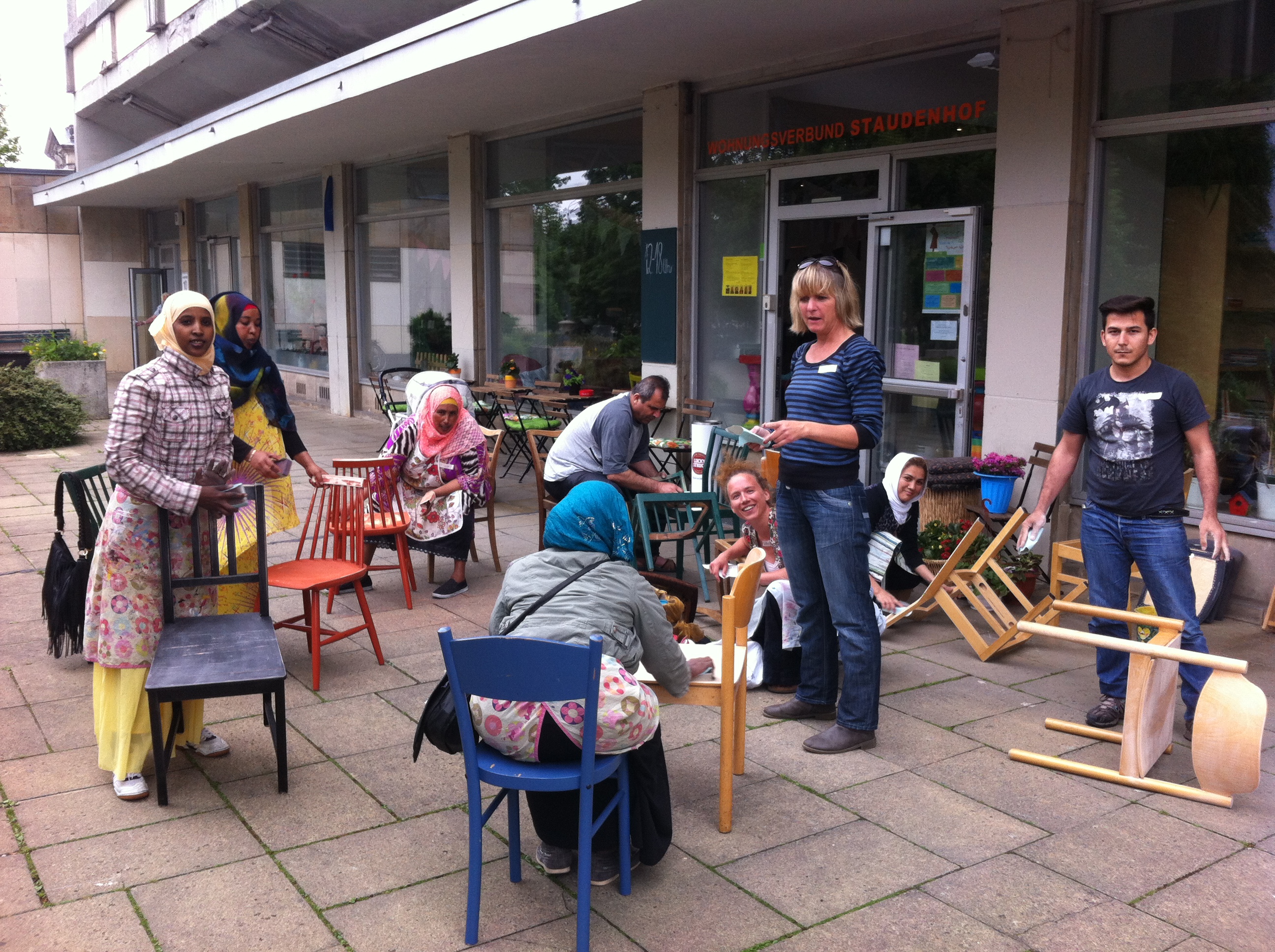 Der CHAIR IT! Upcycling Workshop mit der Künstlerin Steffi Ribbe vom Atelier Farbknall ist am 24. Mai 2016 gestartet! Die TeilnehmerInnen kommen sowohl aus dem Wohnungsverbund Staudenhof, als auch aus der Einrichtung für Flüchtlingsfrauen in der Hegelallee. Erstes Etappenziel am Dienstag: Die Holzstühle abschmirgeln. Anschließend geht es an die individuelle Gestaltung der Stühle, die mit unterschiedlichen Geschichten aus dem Leben der Teilnehmenden versehen werden.