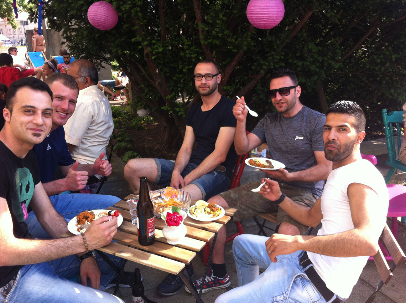 Das Sommerfest im Wohnungsverbund Staudenhof am 4. Juni 2016 war für die Bewohner und das Staudenhof-Team auch ein Anlass um das zweijährige Bestehen zu feiern. Im zweiten Jahr intensivierte sich die Kooperation mit der Fachhochschule Potsdam. Die Studenten sind in vielen Kleinprojekten im Staudenhof aktiv wie z.B. in der Fahrrad-Werkstatt, der Deutsch-Nachhilfe, in Sprach-Tandems und bei interkulturellen Kochabenden. Besonders das Projekt „Staudenhofgarten“, ausgezeichnet mit dem „Sonderpreis-Nachbarschaft“ 2015, bei dem sich eine Garten-AG, bestehend aus alteingesessenen Mietern, Flüchtlingen und Mitarbeitern des Wohnungsverbunds Staudenhof, sowie Angehörige der Fachhochschule, um den Staudenhofgarten kümmert, als auch die Projektwoche „Café-Gestaltung“ wo Flüchtlinge, Studenten und Schüler mit der Künstlerin Steffi Ribbe das Begegnungscafé gestalteten, brachten Nachbarn, Alt-Potsdamer und Neu-Potsdamer zusammen und boten einen Rahmen um sich auszutauschen und voneinander zu lernen.
