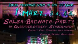 Der Frühling naht, es wird Zeit die dunkle Jahreszeit hinter uns zu lassen. Wir wollen diesen Frühling mit Euch gemeinsam zum Beat von Salsa und Bachata die Hüften kreisen lassen. Lasst uns gemeinsam den Schwung und die Frische des Frühlings in uns aufsaugen und voller Energie bei drei Terminen (1.3, 5.4, 3.5.) im legendären Potsdamer Staudenhof (heute Quartierstreff Staudenhof) das Tanzbein schwingen. Wer pünktlich erscheint und noch keine Ahnung von den Tänzen hat, bekommt die Grundschritte erklärt.